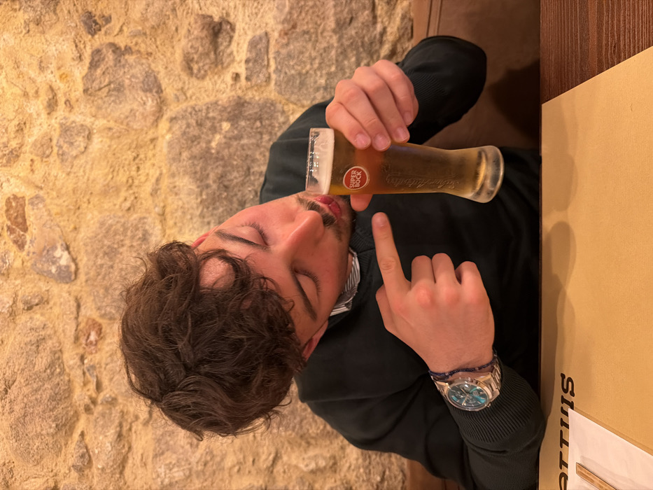 A male individual is depicted in an indoor setting, identified as Mattus - Taberna Típica Portuguesa in Braga, Portugal, based on the partial placemat text. The subject, with dark brown curly hair and a mustache, is wearing a dark green sweater over a striped shirt. He is leaning his head towards a pilsner glass containing a light amber liquid with a head of foam, identified as Super Bock beer by the label on the glass. His lips are pursed as if to interact with the glass's rim. His left hand, adorned with a metallic watch featuring a teal face and a multi-strand bracelet, has its index finger extended and pointed towards the beer glass. His right hand holds the lower portion of the glass. The background consists of a rough, light brown stone wall. The scene is illuminated by warm, artificial lighting.