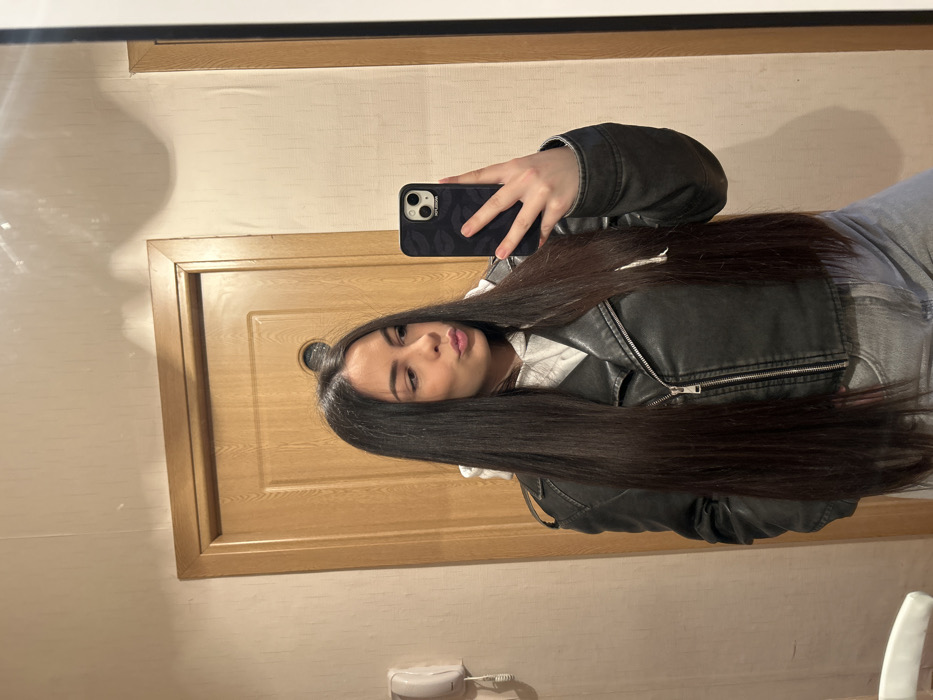 The image displays a mirror selfie of a female individual in an indoor setting
