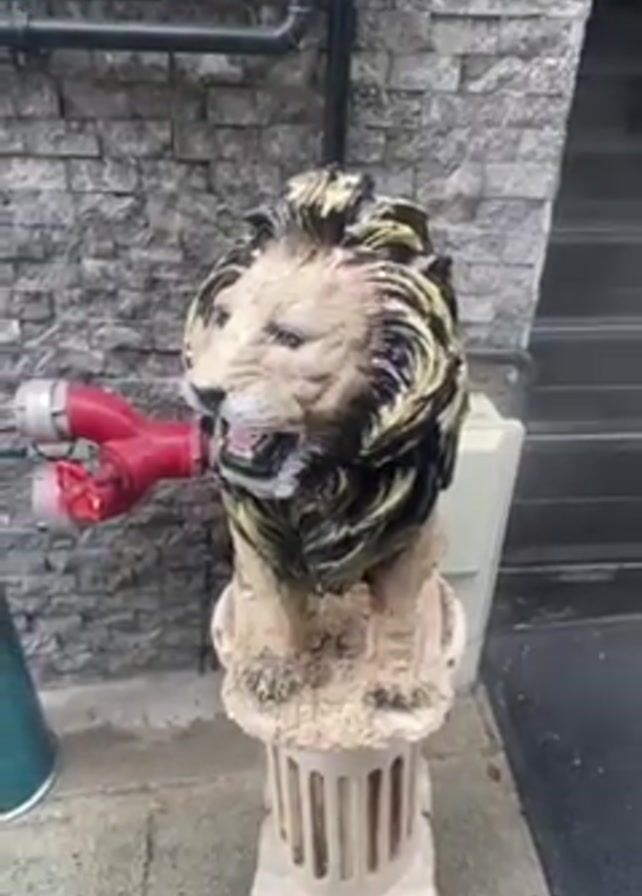 statue of a lion. The lion is off-white with black and beige accents, and it is sitting on a tall, round, fluted base. The lion is roaring, and its eyes are a light color. The statue is sitting outside of a building with gray stone siding. There is a red pipe coming into the shot from the left side of the frame. There are stairs behind the lion statue. The ground is gray concrete. The video appears to be taken outside.