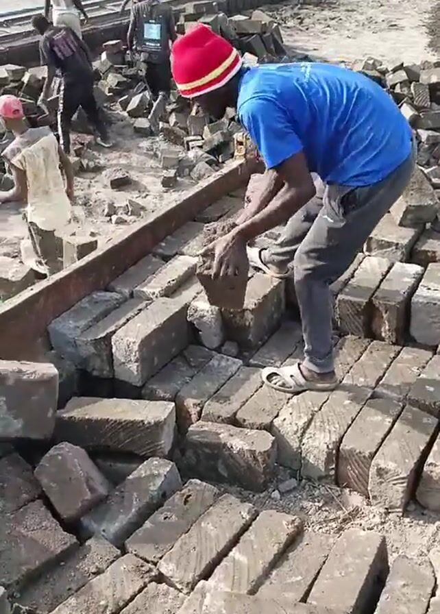 Several workers are handling bricks at a construction site. A man in a blue shirt and red cap is carefully placing bricks within a metal frame. Other workers are nearby, some moving around the site and others handling bricks as well. The area is covered with loose bricks. In the background, a construction vehicle, possibly a bulldozer, is visible.