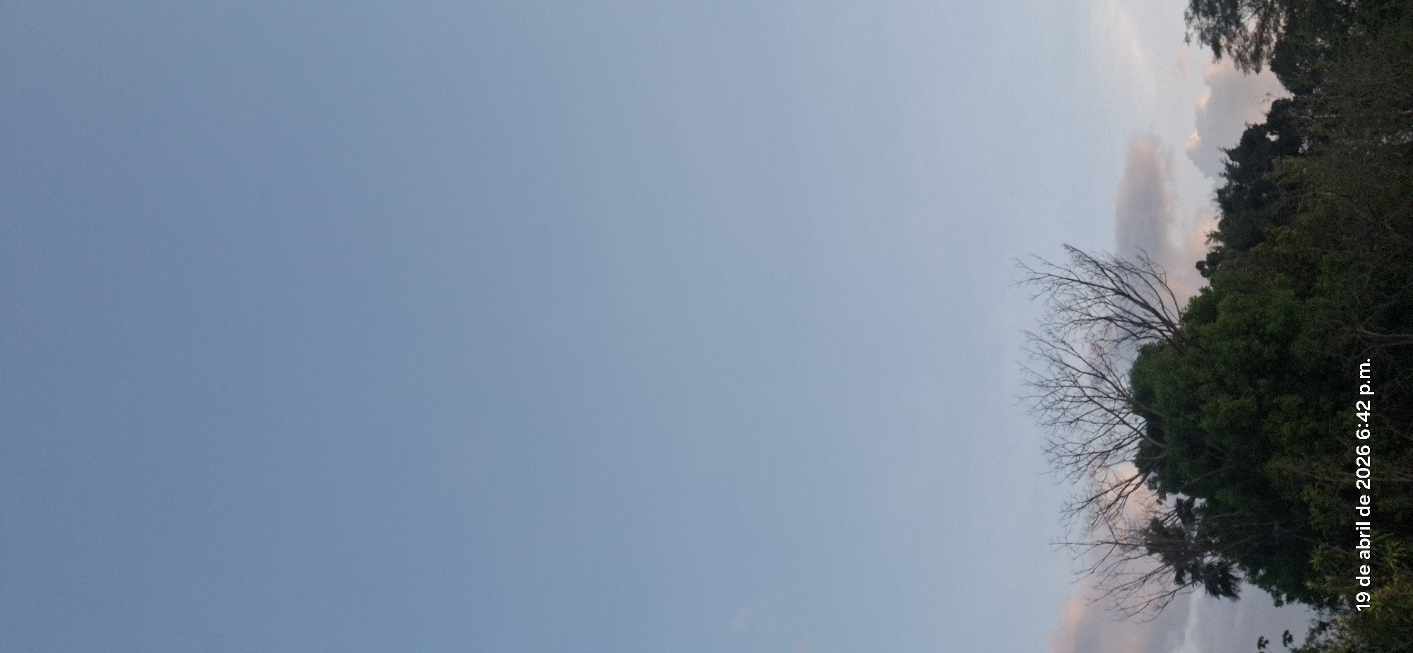 The image captures a view from Vallecito, Venezuela, on April 19, 2026, at 6:42 p.m. The sky occupies most of the frame, showing a gradient of light blue. Along the right edge, dense green trees and some bare branches form a natural border. There are also some clouds in the sky. The date and time are printed in white on the bottom right of the image.