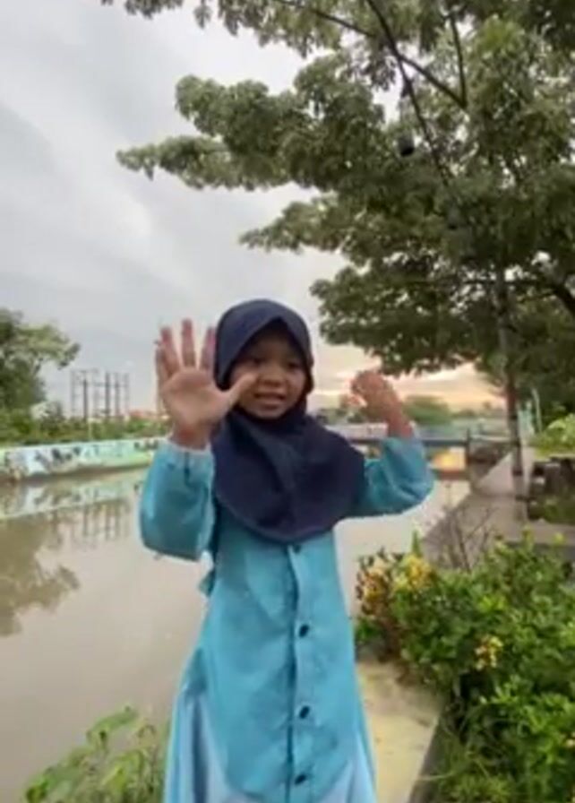 A young girl in a blue dress and dark blue hijab stands by a river, waving and clapping her hands. The river is murky and the sky is overcast. Trees line the bank behind her. The girl then moves closer to the camera and smiles.