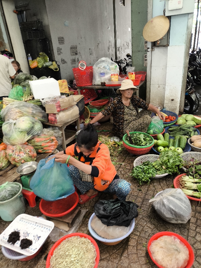 An outdoor market scene is depicted in South Quy Nhon Ward, Vietnam. Two women are actively engaged with market stalls. An older woman, wearing a light-colored conical hat and a patterned dress, sits on the ground with her legs extended, positioned among various baskets of fresh produce including tomatoes, cucumbers, and green leafy vegetables. Adjacent to her, a younger woman, dressed in an orange long-sleeved shirt and patterned pants, crouches, handling a blue plastic bag over a red basin, possibly weighing or packaging goods. Surrounding them is a dense display of market items: * Bags of cabbages, carrots, and other vegetables are stacked on a small wooden table to the left. * Numerous baskets and containers filled with fresh produce, including various gourds, leafy greens, and herbs, are arranged on the ground. * Several red oval tubs on the ground contain different dried goods, such as light-colored grains or spices, and a white tray holds dark, granular substances. * A silver scale is visible near the crouching woman. * In the background, against a textured concrete wall with visible wear and partial markings, motorbikes are parked. A traditional Vietnamese conical hat hangs on the wall. Overturned baskets, red plastic containers, and bottled liquids are also visible on a metal shelf unit behind the older woman.