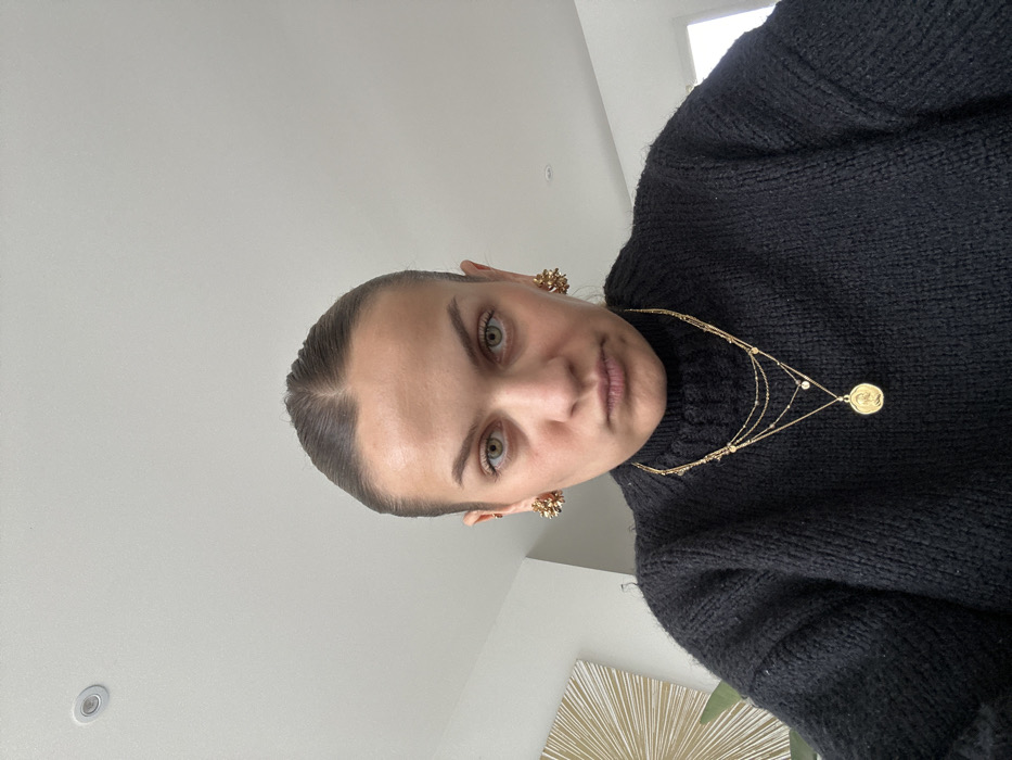 A female subject is depicted in a close-up, chest-up shot within an indoor setting in Veauchette, France. The subject has fair skin, dark brown hair pulled back from her face with a visible center part, and light green-hazel eyes looking directly at the viewer. Her lips are pursed, forming a slight frown. She is wearing a black, ribbed turtleneck sweater. Adorning her ears are two gold-toned stud earrings with a textured, possibly cluster or spiky, design. Around her neck are three layered gold-toned necklaces: an innermost thin chain with a small clear stone pendant, a middle chain with multiple small circular beads, and an outermost chain featuring a larger circular medallion pendant with a raised relief image. The background consists of a light-colored ceiling with a single recessed downlight in the upper left. To the subject's left, a wall features a gold-toned, radiating sunburst or starburst decorative piece, with a hint of green foliage visible at the bottom edge. The wall to the subject's right is plain and light-colored.