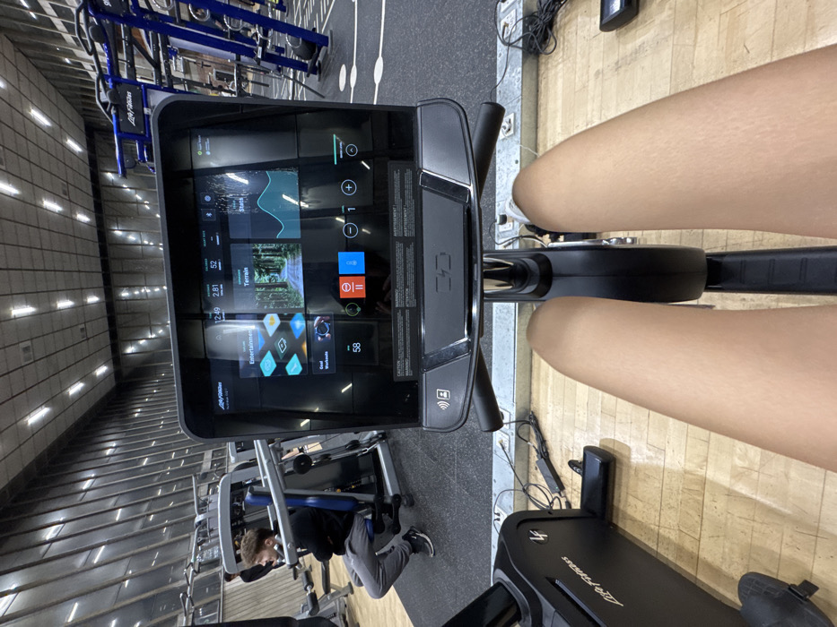 A stationary bike with a large display is positioned in a gym. The screen shows workout data, including a terrain view and entertainment options. A person's legs are visible, suggesting someone is using the bike. Other gym equipment and a person using a weight machine are visible in the background. The gym has light-colored walls and dark floors.