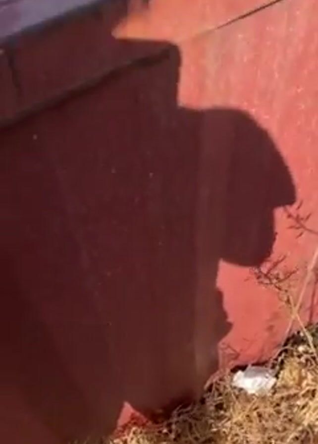 person standing next to a red corrugated metal wall with dried grass and debris at the base