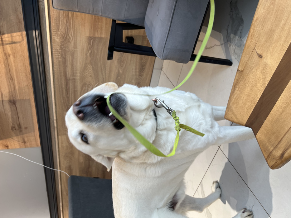 An adult, light-colored (cream/white) Labrador Retriever is depicted indoors, likely in Mytishchi, Russia. The canine is standing, actively biting and holding a section of a neon green leash in its mouth, with its head tilted upward and to the left. Its teeth are visible within its open muzzle. The leash is attached to a black collar worn by the dog via a silver-colored snap hook, and a knot is present in the leash near this attachment point. The environment features a light-tiled floor with visible shadows. The background wall consists of horizontal light-brown wood paneling on the lower section, separated by a dark horizontal trim from an upper, lighter-colored wall. Furniture includes two upholstered chairs: a partially visible dark grey chair on the left and a more fully visible dark grey chair with dark legs and armrests on the right. A wooden table, light brown with a darker horizontal stripe, is partially visible in the immediate foreground at the bottom right.