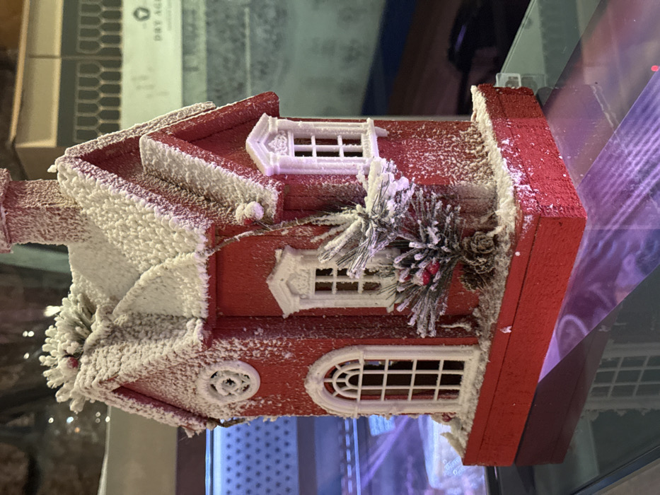 A red miniature house is covered in simulated snow. The house features a white, arched window and two rectangular windows with ornate trim, along with a chimney and what appears to be a decorative rosette. Evergreen sprigs with red berries are positioned between the windows. The house is set on a reflective surface, with blurred objects in the background. The image is rotated ninety degrees.