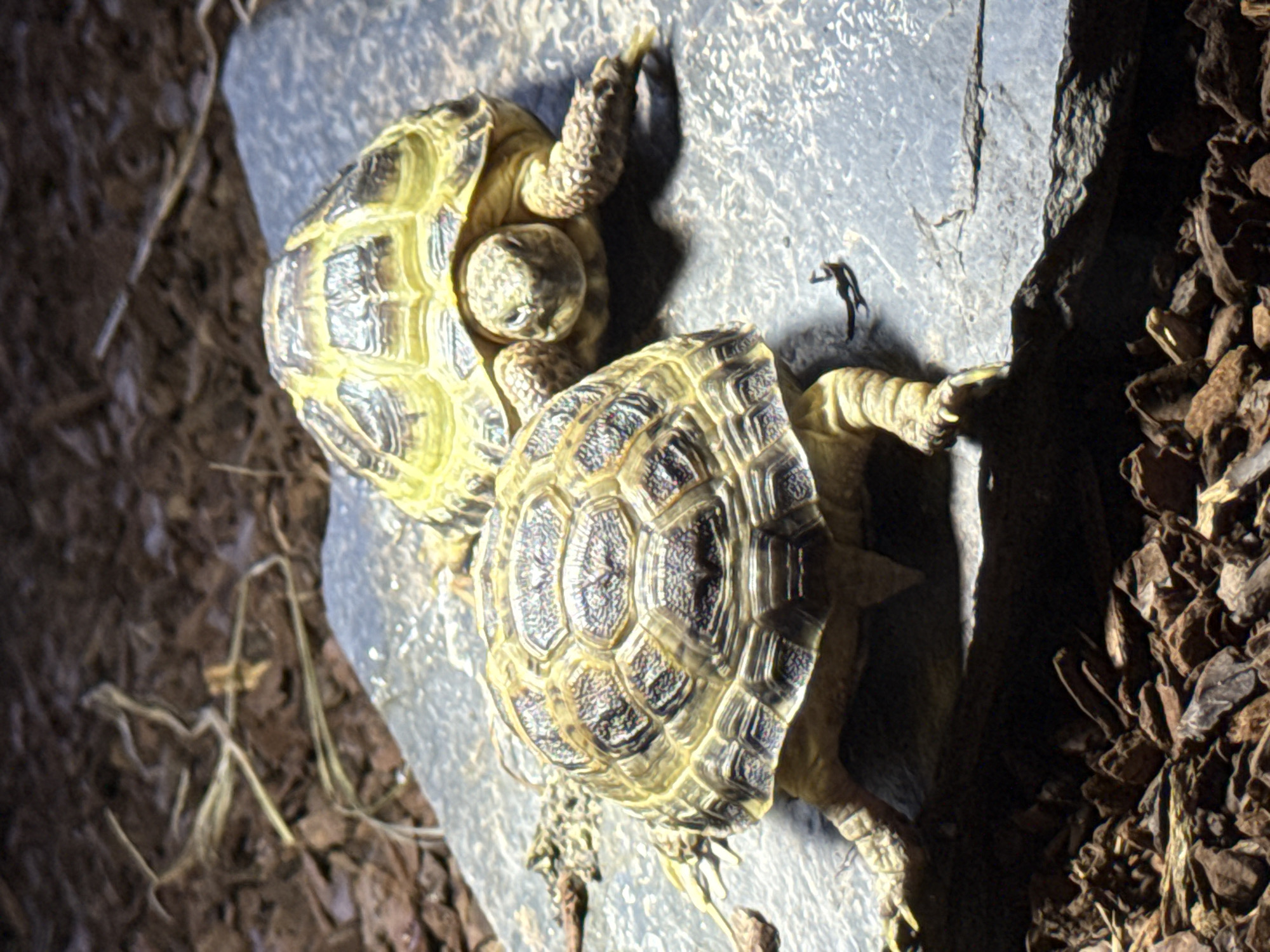 Two tortoises are present on a dark grey, textured stone slab. The tortoise in the foreground faces away from the observer, its yellowish-brown carapace exhibiting distinct dark scute patterns. Its left foreleg is extended towards the lower edge of the stone. A second tortoise is positioned behind and to the right, facing the observer, with its head and forelegs visible. Its carapace matches the coloration and patterning of the first. The stone slab is surrounded by dark brown wood chips and scattered dry plant matter. Overhead illumination casts distinct highlights on the tortoises and stone, creating shadows below. This scene is situated in Geispolsheim, France.