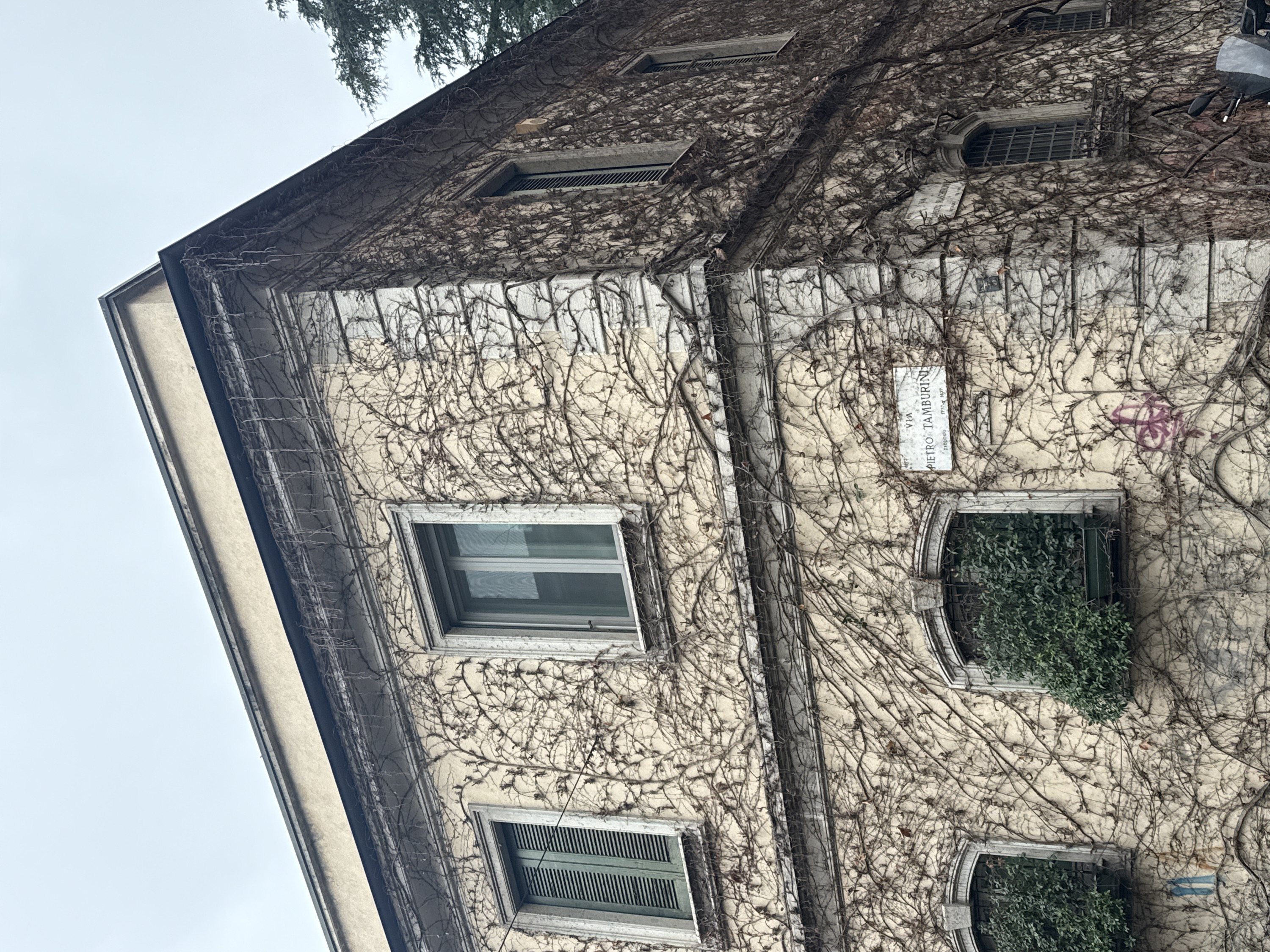 A corner section of a multi-story building, heavily covered in dense, bare climbing vines, is depicted under an overcast, light gray sky. The building, constructed with a light beige or cream-colored facade, features architectural details such as cornices, window sills, and ornate window frames. The location is identified by a white rectangular street sign affixed to the facade, clearly displaying "VIA PIETRO TAMBURINI" in black capital letters. Below this, smaller text reads "FILOLOGO" and the dates "1735 - 1827," indicating the street is named after Pietro Tamburini, a philologist. This street is situated in Milan, Italy. The building exhibits various window types: * On the upper left, a rectangular window with closed green louvered shutters is visible. * Next to it, another rectangular window features light-colored frames and reflective glass panes. * On the right side of the corner, an upper window with closed dark shutters is visible, with a small rectangular wooden box attached to the wall beside it. * On the lower left, an arched window is partially obscured by a dark green window box filled with vibrant green foliage. * On the lower right, another arched window, also with a window box containing similar green foliage, is visible. The bare vines form an intricate network across the majority of the facade, with some dried leaves still clinging. Below the "VIA PIETRO TAMBURINI" sign, a stylized pink or purple heart-like graffiti mark is present. Further to the left on the lower wall, two thin, vertical blue lines of graffiti are discernable. Thin dark wires stretch horizontally across the facade in several locations. A dark green conifer tree is partially visible in the upper right background. In the bottom right corner, a portion of a black motorcycle's windshield and handlebars is visible, parked close to the building.