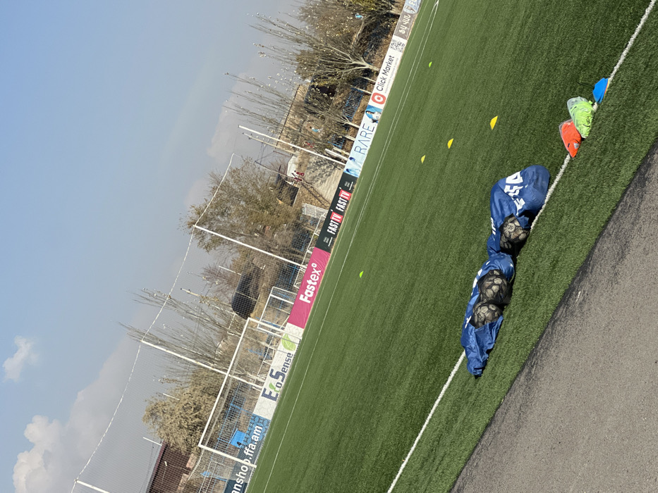 The image displays a synthetic turf soccer field in Charentsavan, Armenia, under a clear blue sky with scattered clouds