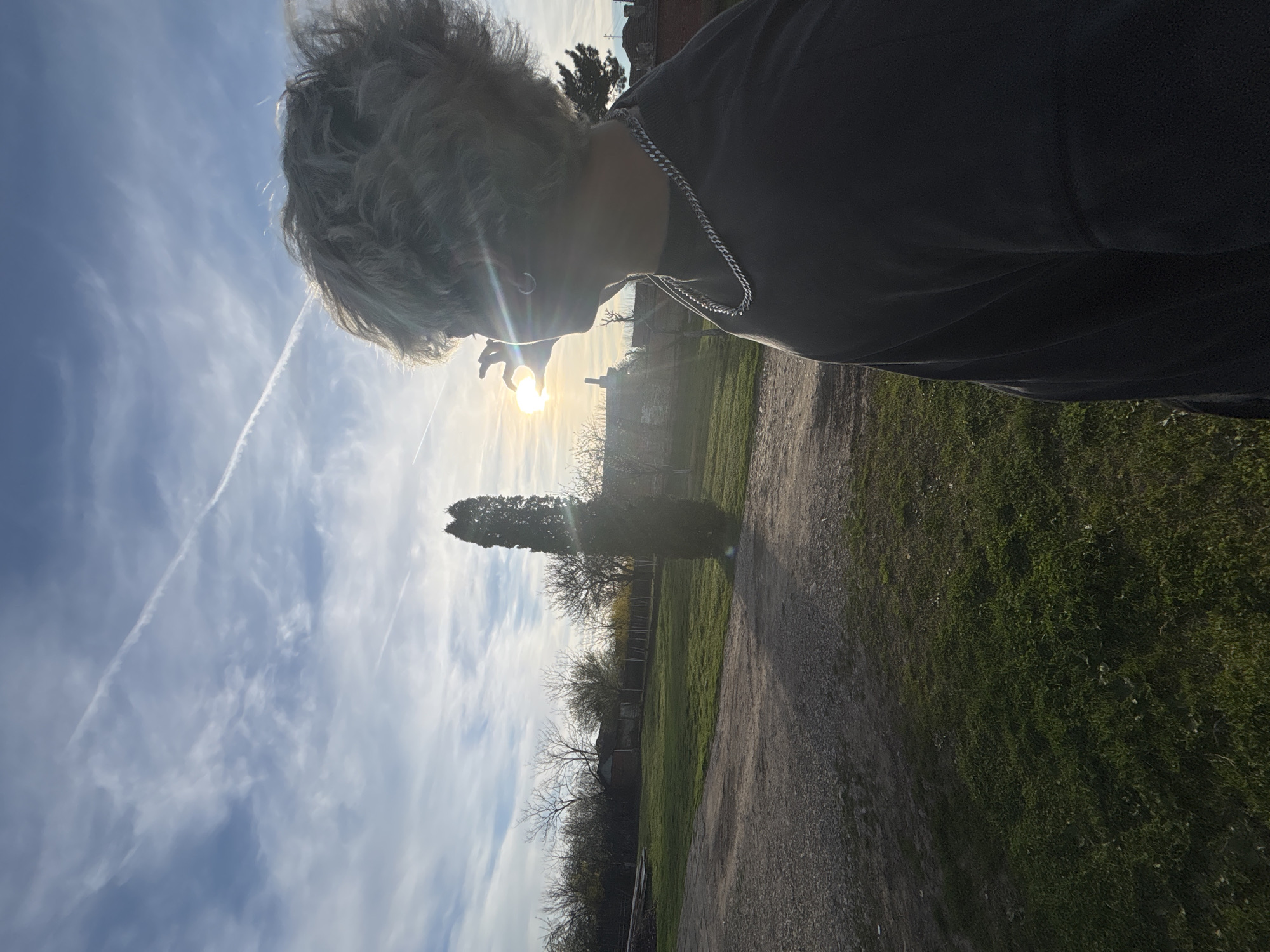 The image depicts a person with short, wavy blond hair standing outdoors, facing the sun. The person is wearing a dark-colored shirt and a silver chain. Their hand is raised, partially obscuring the sun. The background features a blue sky with white clouds and contrails. In the middle ground, there is a dirt path bordered by green grass and trees. A tall, thin evergreen tree is prominent. In the distance, there are buildings and a fence. The location is presumed to be in or around the city of Slavyanovo, Bulgaria.