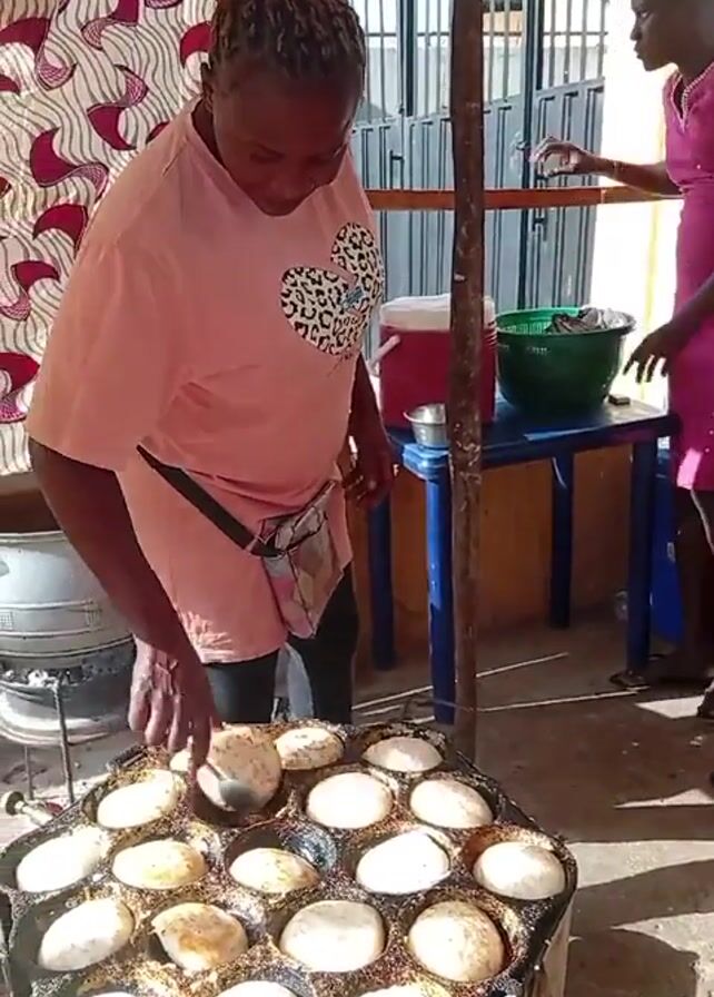 Here's a detailed description of the video: The video shows a woman cooking a food in a pan with round indentations, likely on a street or in an outdoor market setting. The woman, the focal point of the video, is wearing a light pink t-shirt with a heart graphic on it, and dark pants. She has her hair styled in twists. She's standing in front of a black metal pan that's heated, and she is using a spoon to flip or adjust the round, doughy items cooking in the pan. She is focused on the food she's preparing. In the background, there is another woman standing at a blue table, wearing a pink dress and sandals. She appears to be preparing something in a green bowl. There is a white and red cooler on the table. The setting seems to be an outdoor stall or a makeshift kitchen under a partial shelter made of a wooden structure with patterned fabric serving as a backdrop. A metal fence is visible behind the table. There is a large metal pot to the left, near the woman cooking. The lighting indicates it is daytime.