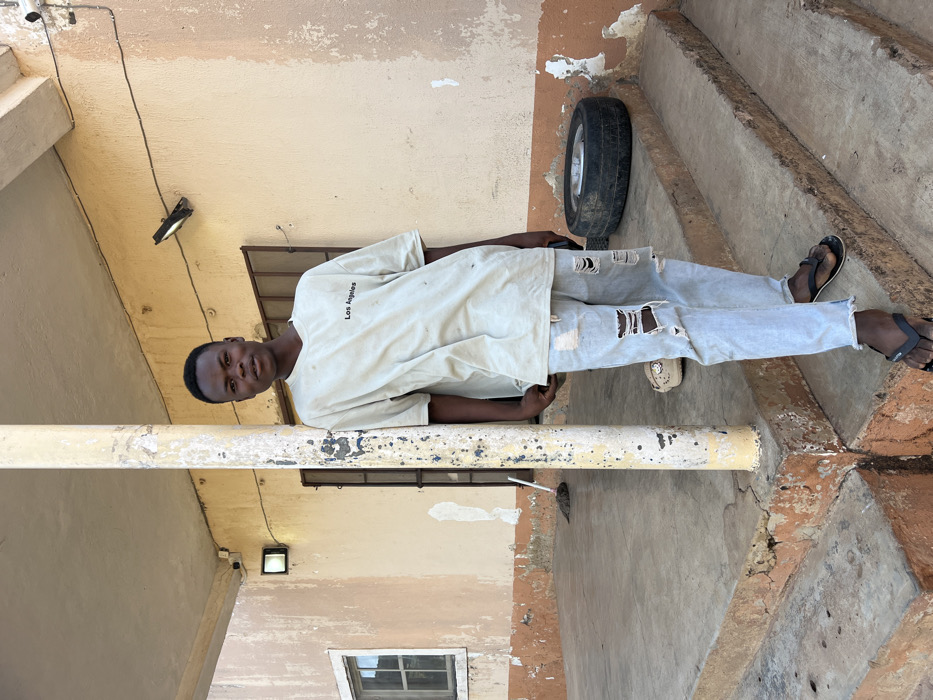 A young Black male stands on the concrete steps of a building's porch in Jos, Nigeria, positioned slightly left of center and leaning his right side against a weathered, light-colored concrete pillar