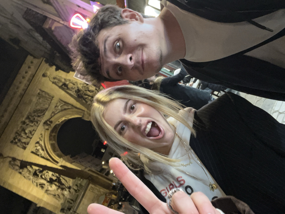 A nighttime selfie captures two individuals in the foreground against the illuminated Arc de Triomphe du Carrousel, located in the Place du Carrousel, Paris, France. The female on the left has blonde hair, an open mouth, and extends her left hand displaying a two-finger peace sign. She wears a white hoodie, a dark pinstriped outer garment, and multiple necklaces. The male on the right, with dark, curly hair, looks at the camera with wide eyes and a slightly open mouth. He is dressed in a light-colored t-shirt under a dark open jacket, with a dark strap visible across his chest. The detailed sculptures and archway of the monument are brightly lit in the background. Faint outlines of people seated at outdoor tables and a blurry reddish-purple neon sign are visible further in the distance to the right, indicating an urban setting.