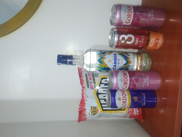The image depicts an indoor scene in Thika Township ward, Kenya, featuring a collection of beverages and a snack bag arranged on a dark brown wooden surface against a light-colored wall. No individuals are present. The primary subjects are: - One clear glass bottle of "CARIBIA GIN" with a blue cap and a label featuring a multi-colored geometric pattern. - Five aluminum cans of ready-to-drink gin and tonic: one blue "GORDON'S PREMIUM DRY GIN & TONIC," three pink "GORDON'S PREMIUM PINK GIN & TONIC," and one orange-brown "B GIN & TONIC SPICED ORANGE." - One partially visible, large red and white bag of "HEROES" brand potato crisps, displaying "EXTREME HEAT" and "BE A HERO" text. The items are static, with the snack bag leaning against the wall on the left, and the gin bottle centrally positioned behind a row of standing cans. A segment of a circular gold-colored frame is visible on the upper right side of the background wall.
