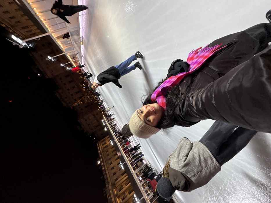 An ice rink scene at night features a selfie-style photo. A woman in a beige beanie, dark coat, and pink scarf poses in the foreground. Two figures ice skate behind her, one standing and another in an apparent fall. A crowd of people stands along the rink's edge, near a building illuminated with string lights and a decorated Christmas tree. The night sky is visible on the left.