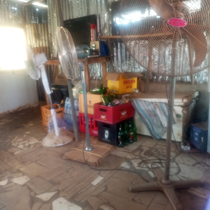 This image depicts the interior of a commercial establishment, likely a bar or small shop, located in Unknown, Unknown. The room features walls constructed from corrugated metal sheeting and a floor composed of irregularly shaped, broken tile pieces. Three electric standing fans are visible: a small white fan on the left, a medium-sized metal fan in the center with a weighted base wrapped in brown material, and a large metal fan on the right with a prominent pink central cap. In the background, a rudimentary wooden shelf unit holds a flat-screen television, a red spray can, and other miscellaneous items. Below the shelf, various crates are stacked: a yellow cardboard box labeled "CHELSEA," a brown crate labeled "GUINNESS," a red plastic crate filled with empty green and brown bottles, and a black plastic crate below it with additional green bottles. To the right of these crates, a large white chest freezer or cooler is present, draped with a striped blue and white cloth. Bright natural light enters through a window on the left side of the frame, illuminating the scene. No individuals are present. Electrical cords are visible on the floor, connecting to some of the appliances.