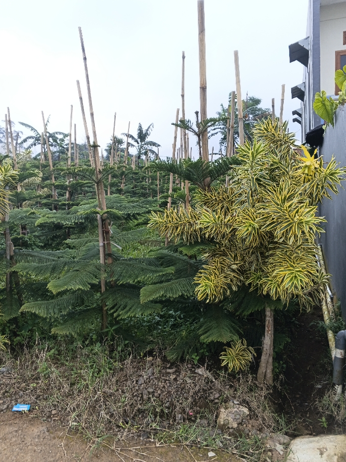 A field of green Norfolk Island pine saplings with bamboo supports stretches into the distance under an overcast sky. Several mature banana trees are visible beyond the pine field. A variegated Dracaena plant stands beside a grey wall, its yellow and green foliage providing contrast. Weeds and small rocks cover the foreground, alongside a small blue object on the pavement.