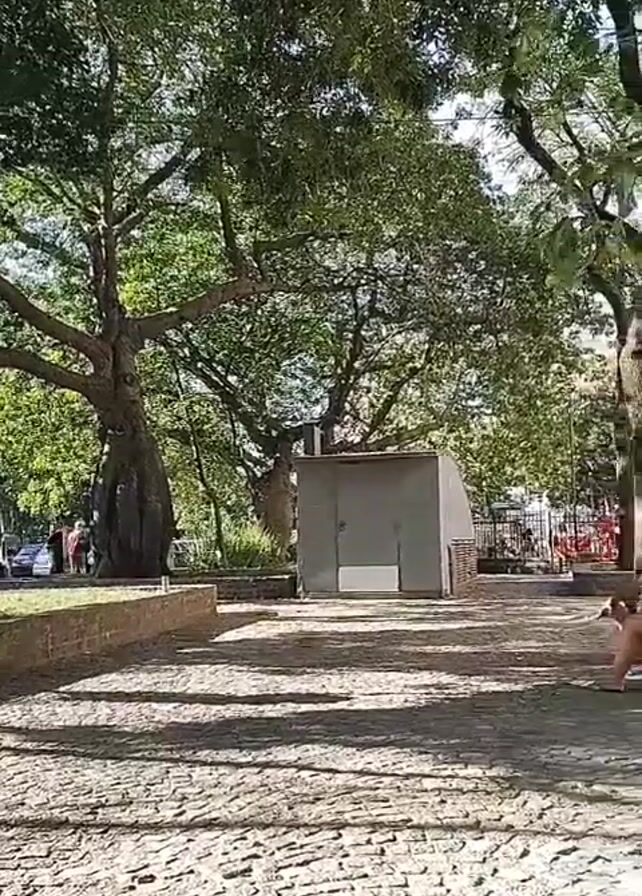 park with cobblestone ground. There are trees that provide shade, a gray building, a couple sitting on a bench, a statue with a plaque, and some playground equipment. The camera slowly pans to the right.