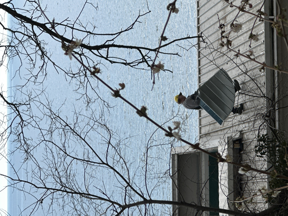 An adult male is observed walking across a corrugated metal rooftop overlooking the Black Sea in Varna, Bulgaria. The individual, wearing a yellow baseball cap, a grey long-sleeved shirt, dark overalls or pants, and dark work boots, is positioned on the light-grey corrugated roof, moving from left to right. He is carrying a large, light-colored, rectangular corrugated metal panel, which appears to be bent or folded. To the left of the man, partially obscured by tree branches, is a flat-roofed structure with a dark window or opening. The background features a vast expanse of light blue, rippled water, characteristic of the sea, meeting a distant, slightly lighter horizon under an overcast or bright sky. The foreground is dominated by numerous bare tree branches with emerging buds or dried botanical remnants, indicating late winter or early spring conditions. The viewpoint is elevated, looking down towards the roof and the sea.
