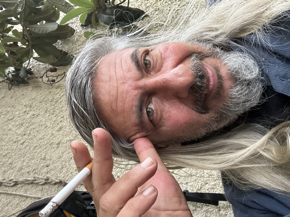 An adult male with long, wavy grey hair, a grey beard and mustache, and green eyes is depicted in a close-up, chest-up shot in Beit Yitshak Sha'ar Hefer, Israel. He is looking directly at the camera with a slight smile. His left hand is raised, with his index finger positioned near his left temple and his thumb holding a lit cigarette with an orange filter between the thumb and index finger. The cigarette has a visible ash tip. He is wearing a dark blue collared shirt over a darker undershirt. The background features a light-colored, textured wall. To the upper right, green foliage is visible, along with a metallic decorative item resembling a crescent moon and star hanging on the wall. A dark strap or object is partially visible in the upper left background.
