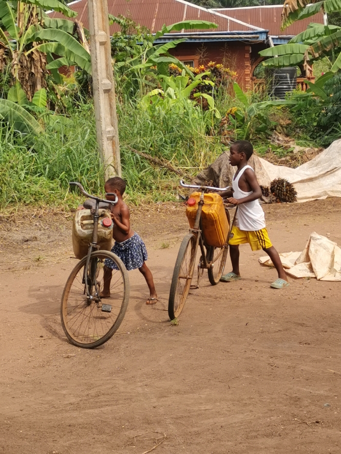 Two children walk with old bicycles on a dirt road. Each bicycle carries a yellow jerrycan. One child wears a white tank top and yellow shorts, while the other wears a blue patterned skirt. Lush vegetation and a building with a red roof are visible in the background. A concrete pole stands near the children. The scene appears to be in a rural area.