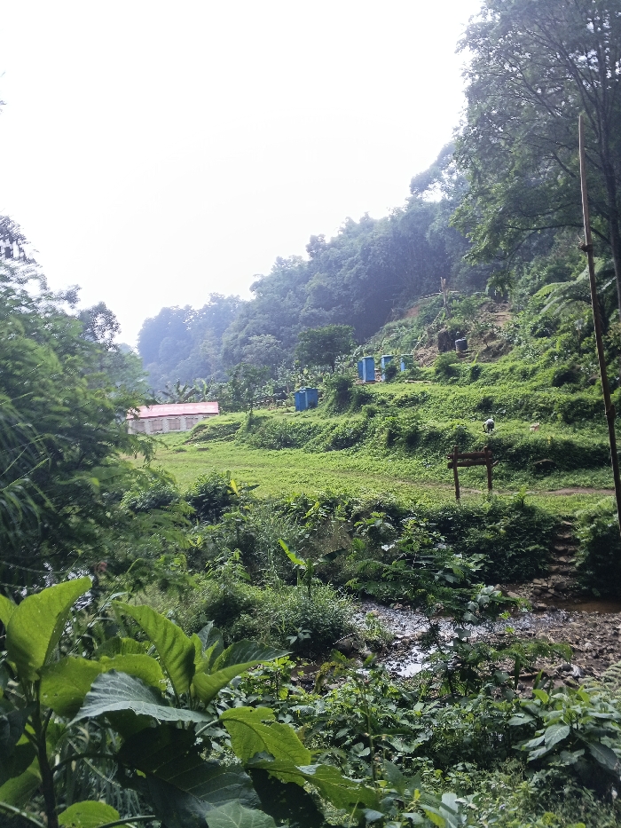 A lush, green landscape features a small, light-colored building with a red roof nestled in the distance. A stream flows through the foreground, surrounded by dense foliage. Up a grassy hill, blue water tanks are arranged in a row, hinting at a water source. A wooden sign and steps suggest a path. The scene evokes a sense of tranquility and natural beauty.