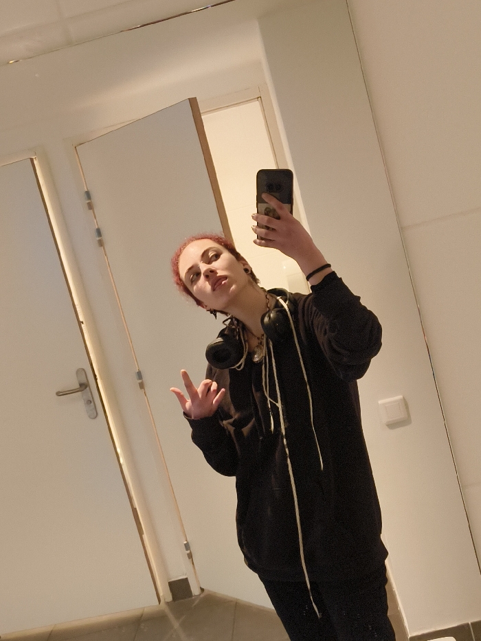 - "A mirror selfie, taken in an interior room in the city of Unknown, Unknown, depicts a young adult individual with short, reddish hair and visible ear gauges" by FM-DK2QL2, licensed under CC BY 4.0