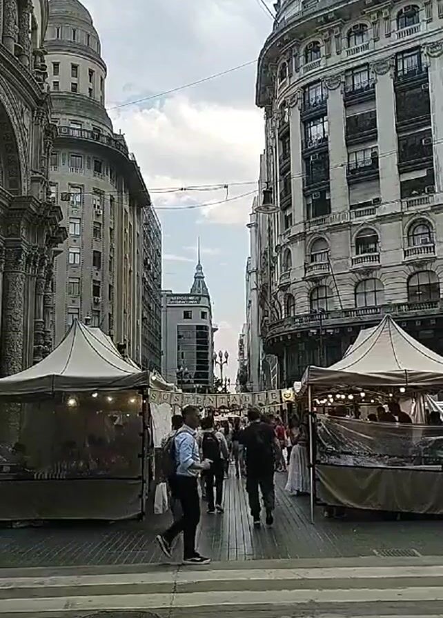 city street lined with buildings and a market. People are walking through the market, browsing at the stalls. A motorcycle passes by in the foreground. The sky is cloudy.