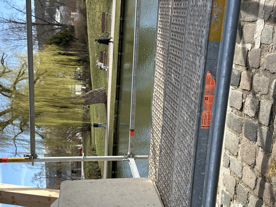 The image depicts an outdoor scene in Weißenburg in Bayern, Germany, under clear, sunny conditions. The foreground is occupied by a construction element featuring a concrete block on the left and a metal scaffolding platform extending across the lower half of the frame. The platform is gray, perforated, and features a red warning sticker with German text ("Original hat zum Layher Blitz-Gerüst ... Layher Absturzsicherung") on its horizontal support bar. Below the scaffolding, the ground is composed of irregular cobblestones. Beyond the scaffolding and cobblestones, a calm body of water, green in tint, stretches across the midground. On the far bank of this water body, a grassy slope leads to a paved pathway. A large weeping willow tree with light green, early spring foliage stands prominently to the right of the scene's center. Three individuals are present on the pathway: one person in a dark jacket walks from left to right, one person in a white hoodie and dark pants sits on a wooden bench, and one person in a long dark coat walks from right to left, past two unoccupied wooden benches. In the background, beyond the pathway, are additional trees, some bare and some evergreen, and indistinct buildings under a clear blue sky.