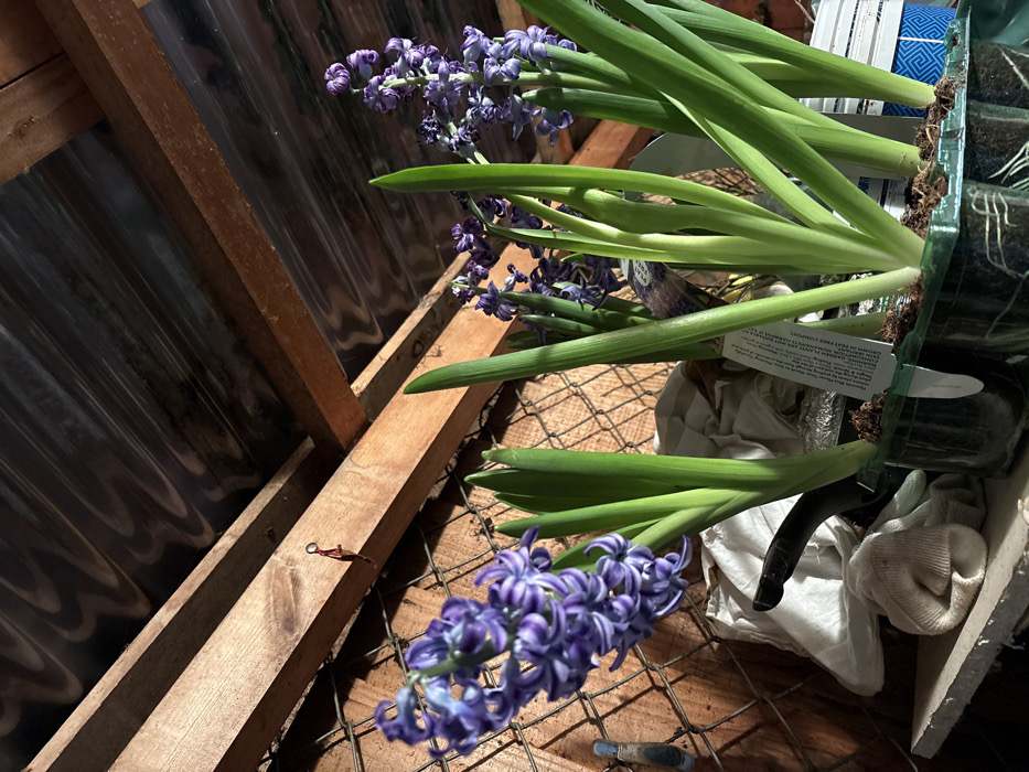 The scene depicts multiple potted hyacinth plants within what appears to be a semi-enclosed structure, likely a shed or potting area, in Oswestry, United Kingdom