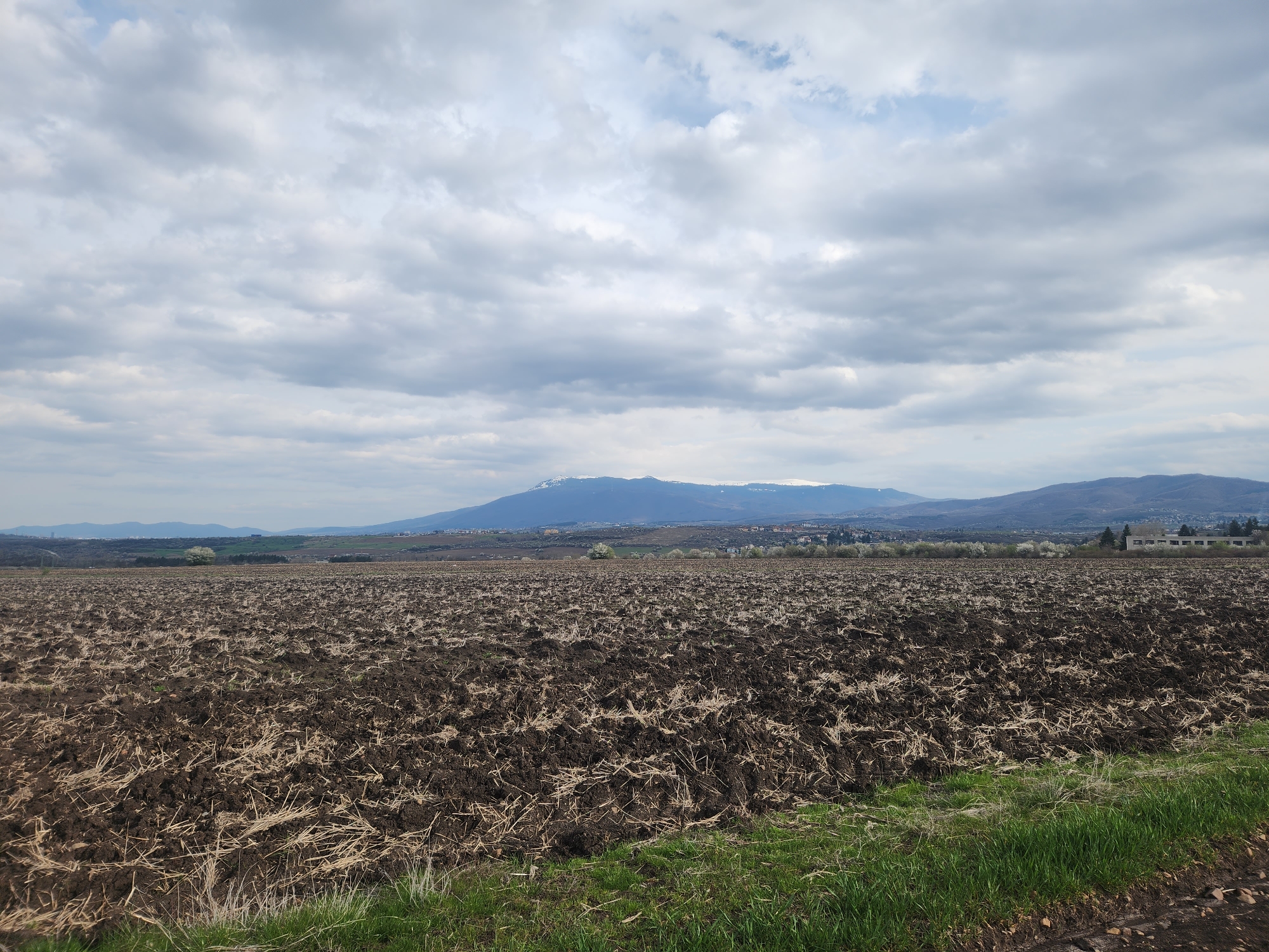 The image depicts a plowed field located in Ivanyane, Bulgaria. The field's soil is dark and recently tilled, with remnants of dry straw scattered across the surface. In the background, a mountain range is visible, with patches of snow on its peaks. A town is situated at the foot of the mountains. The sky is overcast with gray clouds. Green grass grows along the edge of the field in the foreground.