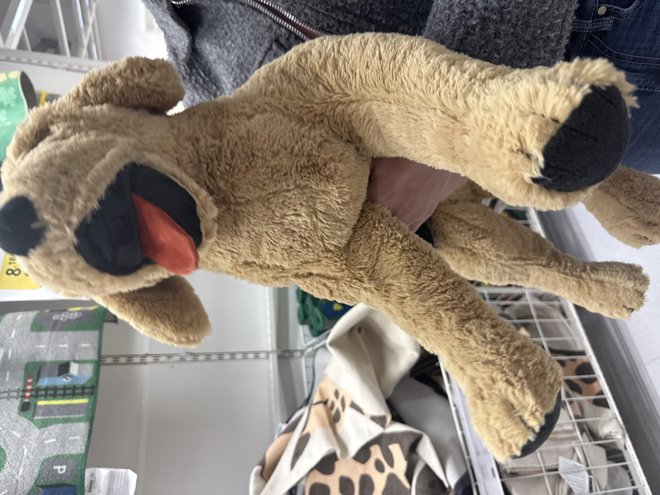 In a retail store, located in Unknown, Unknown, an individual wearing a dark grey textured zippered jacket and blue jeans holds a large, light brown plush dog toy. The toy, resembling a Labrador Retriever, features black eyes, a black nose, an open mouth with a red tongue and black interior, and black paw pads. The person's right hand and forearm support the toy upright. In the background, white metal shelving units display merchandise, including a green playmat with a road design, folded fabric with a brown and beige animal print, and bins containing green textile items. A yellow price tag partially visible in the upper right shows "8.1".