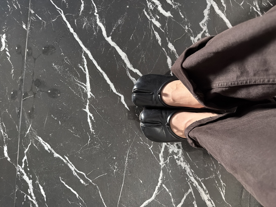 The image presents a top-down, close-up view of a person's lower legs and feet, located indoors on a polished black marble floor in Villahermosa, Mexico. The individual is wearing black leather tabi-style shoes, characterized by a split-toe design. Dark brown trousers with a relaxed fit cover the calves, revealing bare ankles and the top of the feet. The floor consists of large, reflective black marble tiles prominently patterned with irregular white veining. Overhead lighting illuminates the scene, casting subtle reflections on the shoes and floor surface. No other subjects or actions are discernible.