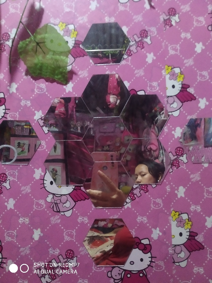 The image depicts an interior space, likely a bedroom or personal room, in Cipinang, Indonesia. The walls are covered in pink wallpaper featuring a repetitive pattern of Hello Kitty characters, some with wings and floral accessories, against a white diagonal grid. Affixed to this wallpaper is an irregular cluster of hexagonal mirrors. Reflections within these mirrors capture various elements of the room and an individual. A central mirror reflects a person's hand, holding a pink smartphone with a dual camera, making a peace sign gesture. A portion of the person's face, specifically the right eye and forehead, is visible in an adjacent mirror. Other reflections show parts of the room, including: * A green, leafy object, possibly a plant or artificial foliage, hanging from above, visible in the upper left mirror. * A light-colored dresser or cabinet featuring cartoon character decals, including a partial view of Mickey Mouse, seen in a lower-left mirror. * Various objects and textures, predominantly in shades of pink, red, and white, likely clothing, fabrics, and other room decor, are visible in other mirror segments. One reflection in a lower mirror shows a person's head and shoulder wearing a red garment. The bottom left corner of the image contains a watermark: "SHOT ON REDMI 7 AI DUAL CAMERA."