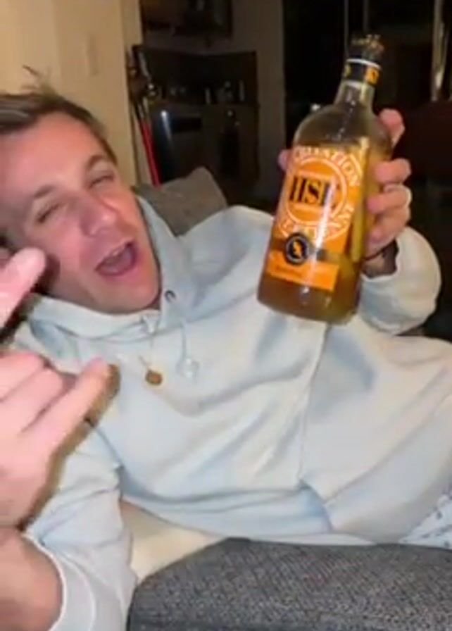 A man is laying back on a gray sofa, holding a bottle of HSE Habitation Saint-Etienne rum. He is wearing a white hoodie and white sweatpants. The bottle is mostly full. A small gold necklace is visible on his chest. The background shows a glimpse of a kitchen with dark cabinets and a doorway leading to another room. The man is gesturing with his left hand. He appears to be speaking.