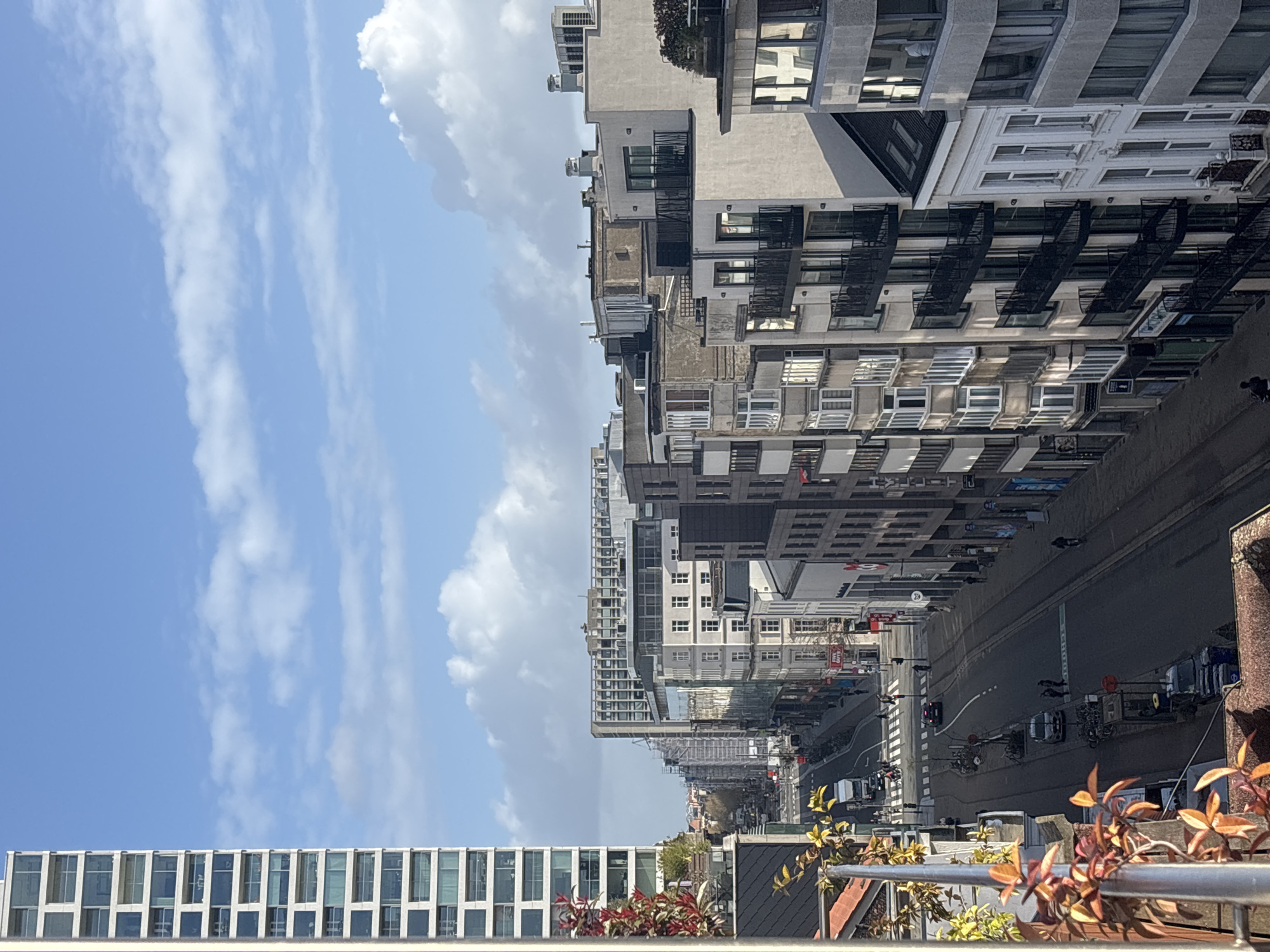 A streetscape in Antwerp, Belgium, is viewed from an elevated perspective, possibly from a balcony or rooftop. The view captures buildings of varied architectural styles, from historic facades to modern structures. A street with vehicular and pedestrian traffic runs between the buildings. The sky, with its blue hue and white clouds, dominates the upper left portion of the frame. In the lower part of the image, there is a balcony railing with plants.