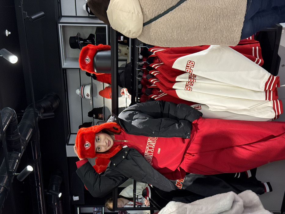 The image displays the interior of an Avtomobilist Yekaterinburg fan shop in Yekaterinburg, Russia. A young adult female stands centrally, facing the camera with a slight smile. She is dressed in a red furry ushanka-style hat featuring the Avtomobilist Yekaterinburg winged 'A' logo, a black puffer jacket, a red hooded sweatshirt with 'CONTIИUE 1986' printed on the chest, and matching red sweatpants. Her right hand is raised, touching the top of her hat. Two other individuals are partially visible in the background: one on the left in a light-colored hooded garment, and another on the right, seen from the back, wearing a beige textured hooded jacket. The store's interior features black display shelves stocked with various Avtomobilist merchandise, including multiple red ushanka hats, knit beanies, and a prominent rack of red and white varsity-style jackets with "946" embroidered on the sleeves. The ceiling is dark with exposed utilities and track lighting fixtures illuminating the retail space.
