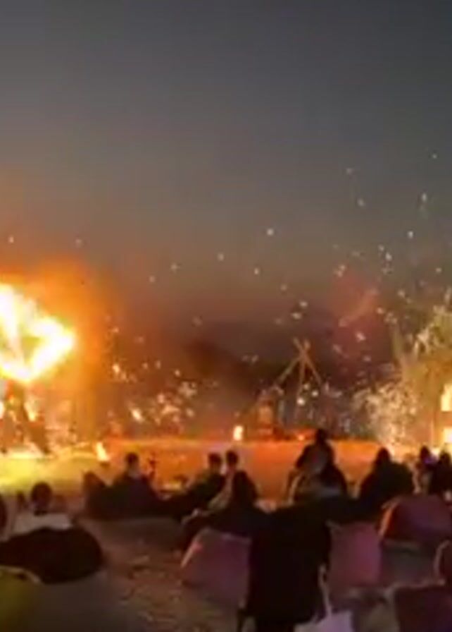 nighttime beach scene where a crowd of people are seated on beanbag chairs facing two large displays that are shooting fire and sparks