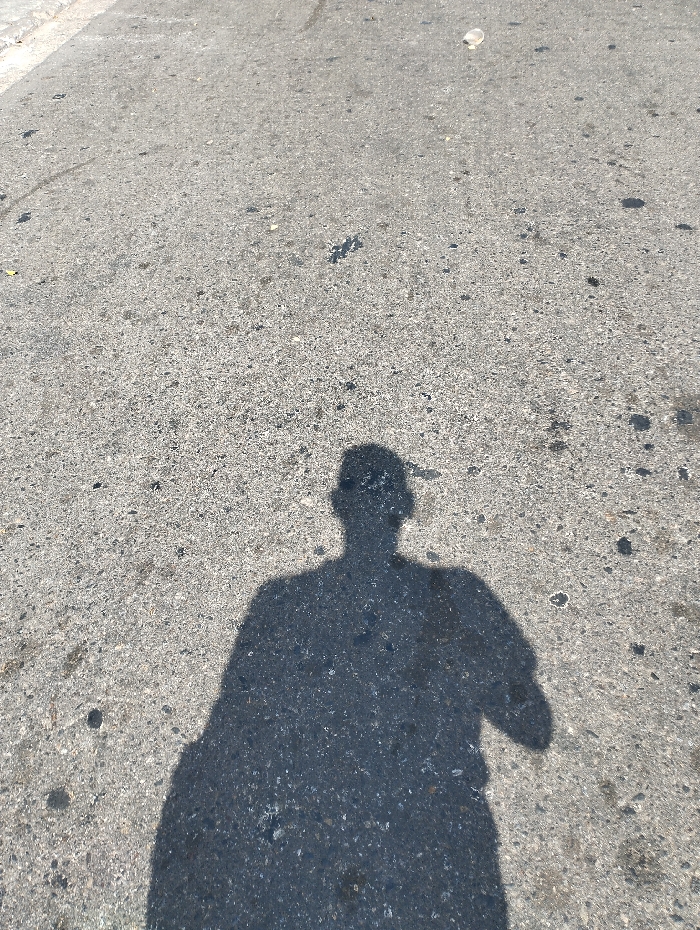 A ground-level view captures a sunlit, mottled grey asphalt surface in Guacara, Venezuela. A dark, distinct human shadow, oriented with its head towards the top of the frame and body extending into the lower half, dominates the foreground. The shadow indicates an individual with a visible torso and a partially bent arm. The pavement surface is rough-textured, exhibiting numerous small dark stains and scattered light-colored specks. In the upper center, a small, light-colored piece of refuse, possibly plastic or crumpled paper, rests on the ground.