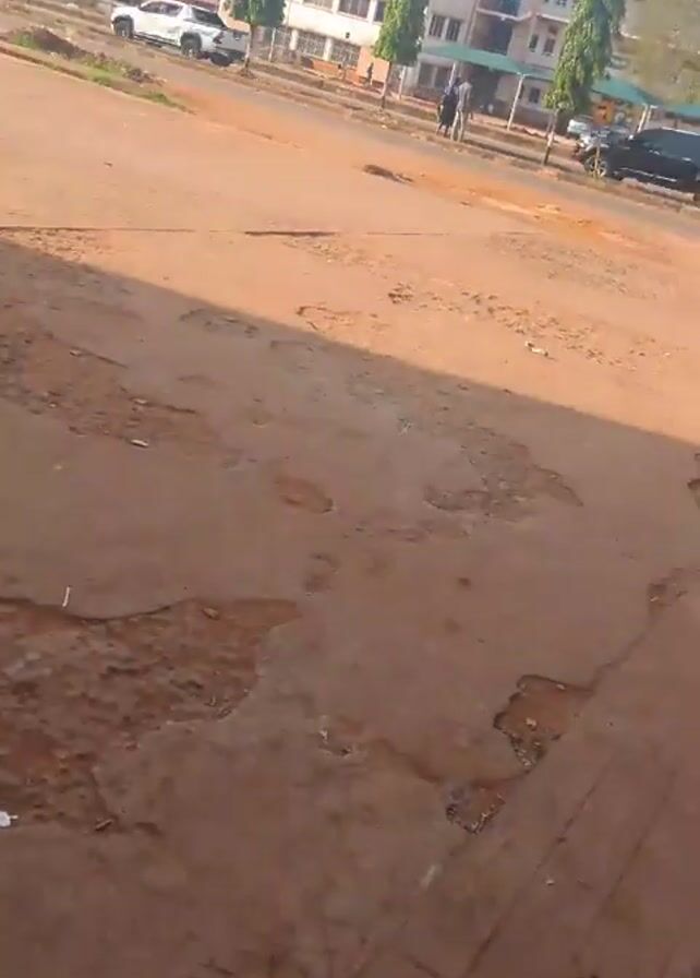 street with damaged asphalt in the foreground