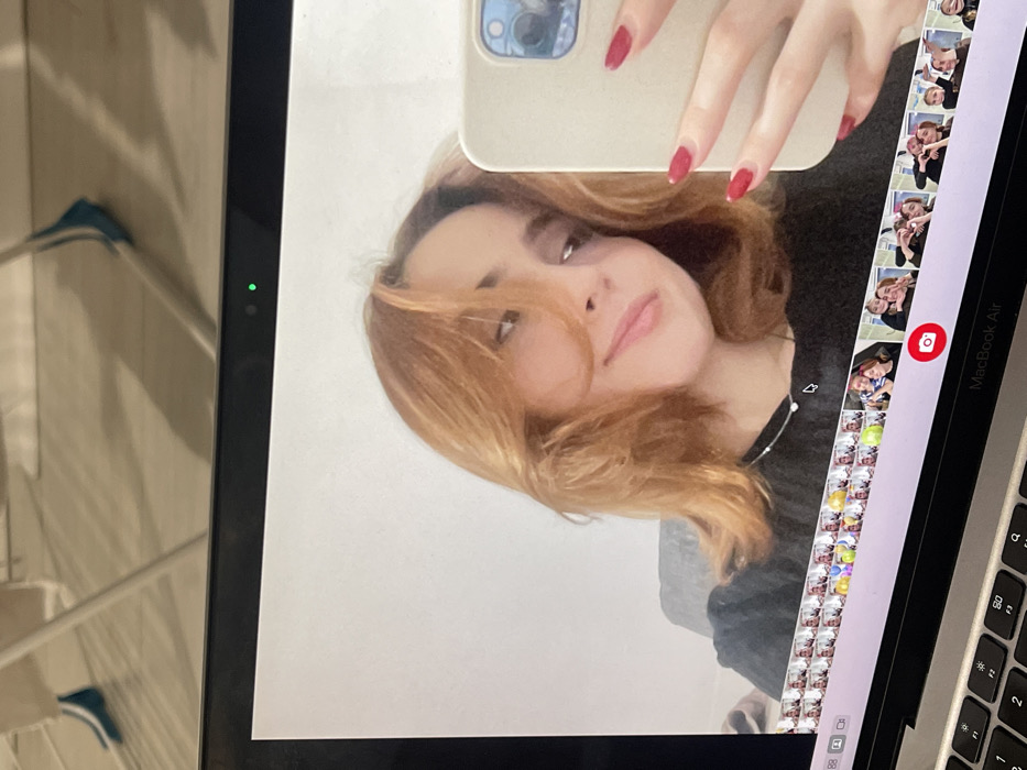 A close-up photograph depicts a black MacBook Air laptop screen displaying a digital image, with a portion of a room visible above it. The laptop screen prominently features a selfie of a young female with medium-length, layered, reddish-brown hair, wearing a dark top and a thin necklace with a small, spherical pendant. She is positioned slightly off-center, with her head tilted and a subtle smile directed towards the viewer's left. Her right hand, adorned with red nail polish, holds a light-colored smartphone equipped with a visible triple camera array, which is being used to capture the reflected selfie displayed on the screen. Below the main image on the laptop, a horizontal strip of smaller thumbnail images shows a series of additional selfies and group photographs. A red circular camera icon is present in the bottom right corner of this thumbnail strip, and a white arrow cursor is visible on the main image, pointing towards the female's necklace. Above the laptop screen, a light-colored floor, possibly tiled, and a segment of white metal furniture with light blue leg caps are visible in the background. A small green light is illuminated on the top bezel of the laptop screen, indicating the camera's activation. The specific location in Reims, France, is not discernible from the visual information within the image.