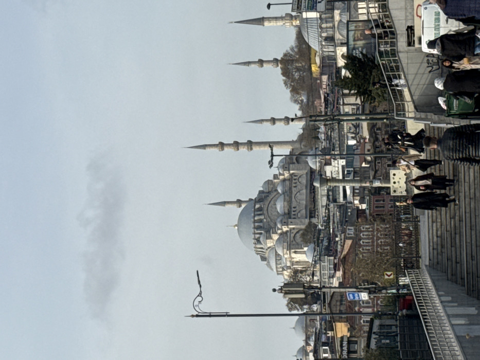 The image depicts a cityscape featuring prominent mosque architecture with multiple domes and minarets. A cloudy sky forms the backdrop, while streetlights and buildings fill the foreground. Pedestrians walk along a pathway, and various signs and street furniture are visible amidst the urban setting.