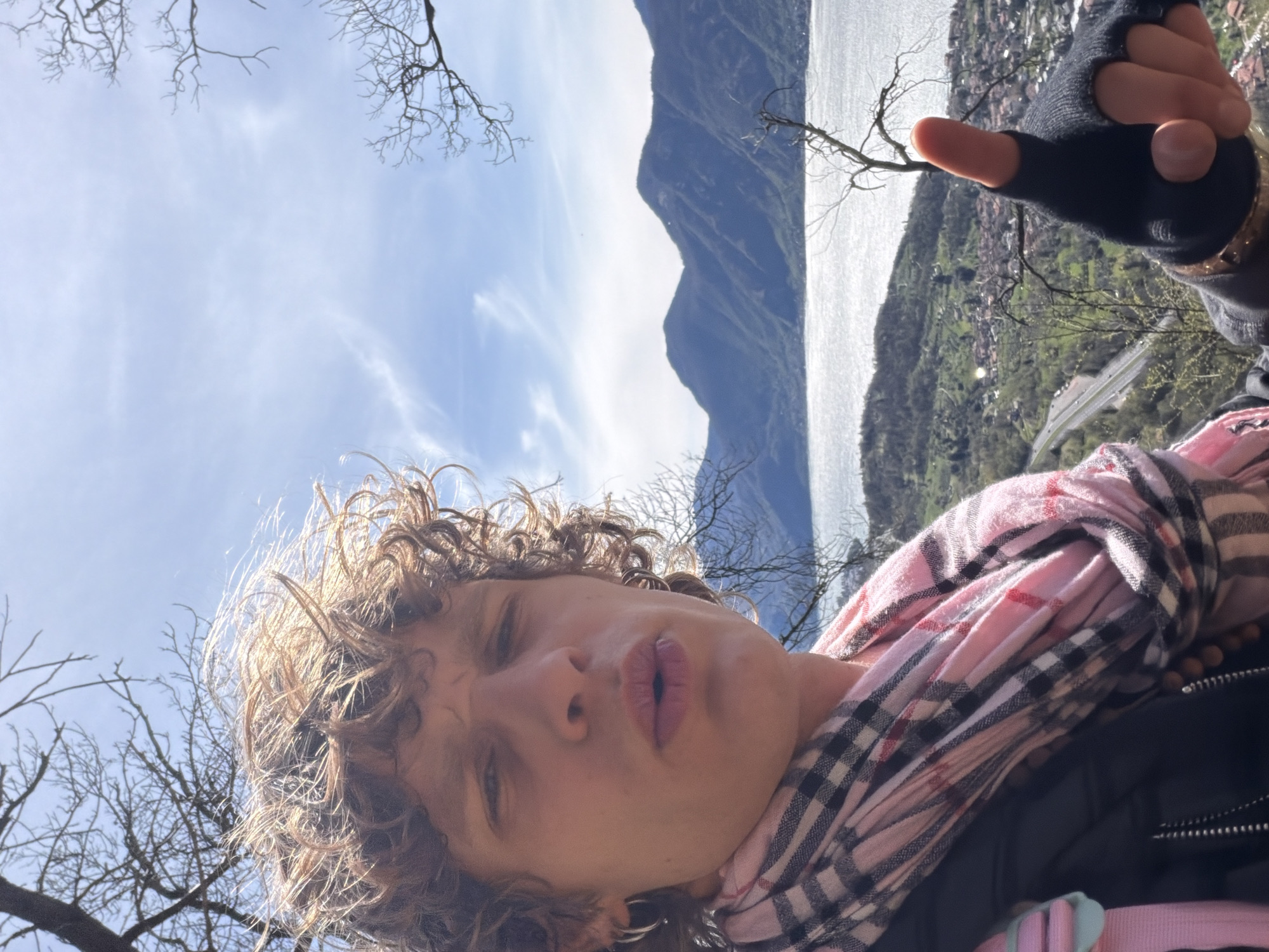 selfie taken from a low angle, likely by a person wearing a pink plaid scarf and a black fingerless glove. The background features a body of water, potentially a lake, with mountains in the distance and some buildings on the shoreline, suggesting a settlement. The sky is blue with scattered clouds. Bare tree branches are visible in the foreground, framing the scene. The location is Lierna, Italy, evidenced by the landscape and architecture visible in the background.