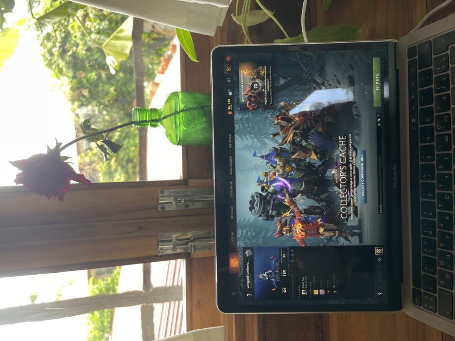 A MacBook Pro displays the Dota 2 game menu. A "Collector's Cache" banner promotes new hero sets for various characters. The user interface shows details like in-game currency (26,730), hero profiles, and options for arsenal, viewing, and knowledge base. Adjacent to the laptop, a red rose rests in a green bottle near a window. The window reveals a lush green outdoor scene. The keyboard layout is in Cyrillic.