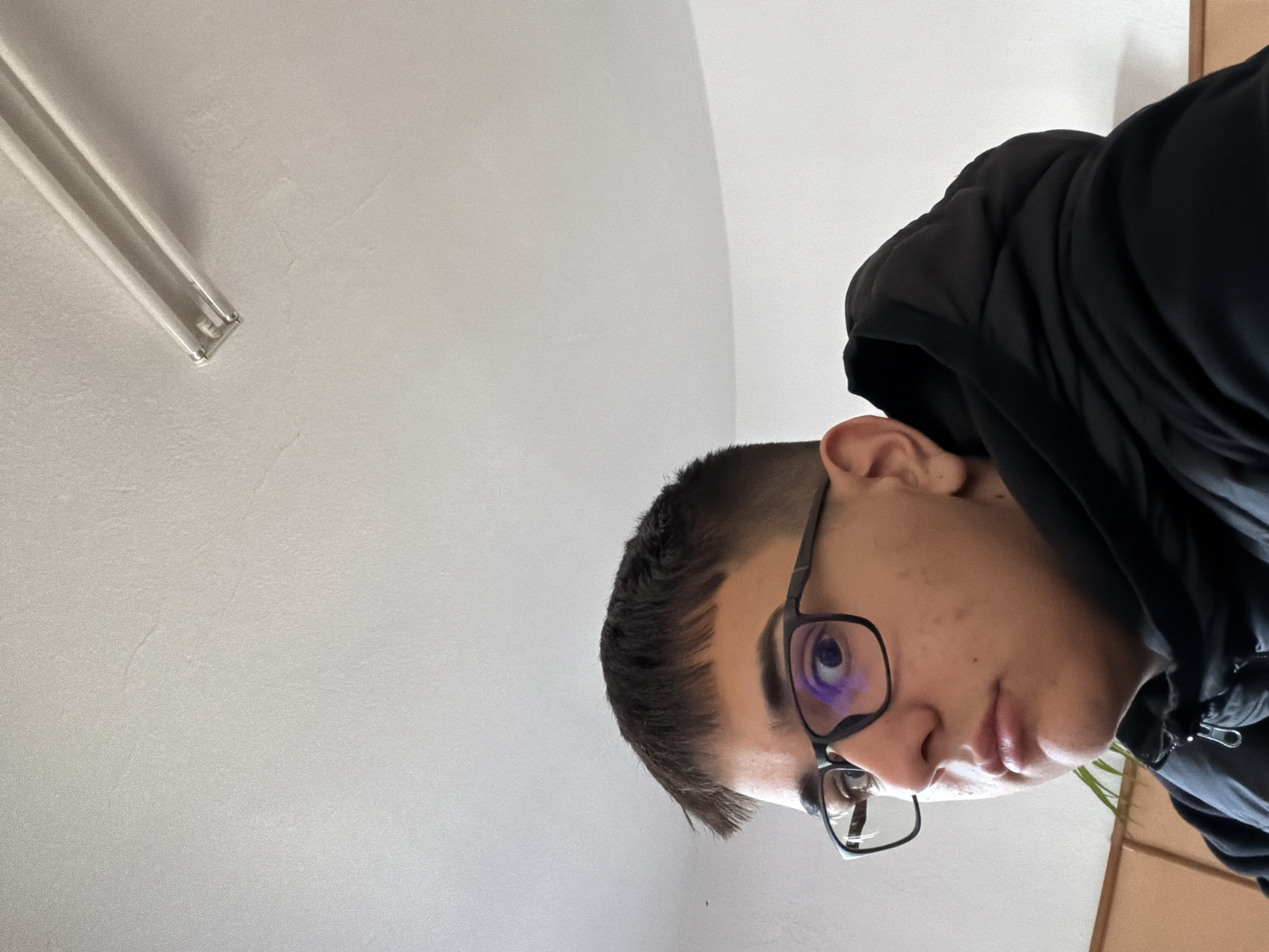 A close-up, low-angle shot of a young man with short dark hair and glasses. He is wearing a dark-colored hooded jacket. The background is predominantly a white ceiling with a fluorescent light fixture visible in the upper left corner. The image does not provide sufficient information to identify the location as Panagyurishte, Bulgaria.