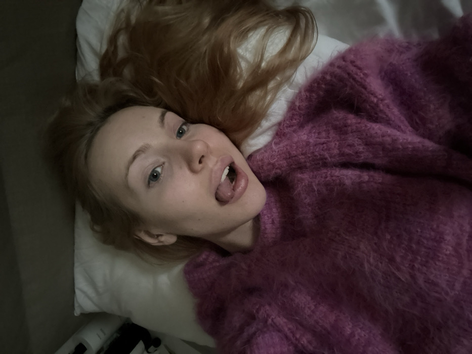 A fair-skinned woman with red hair reclines on a white pillow, facing upward at an angle. She wears a dark pink, fuzzy sweater. Her mouth is open, and her tongue is sticking out. The background consists of a dimly lit room with indistinct shapes and a portion of a neutral-colored surface near the bottom left.