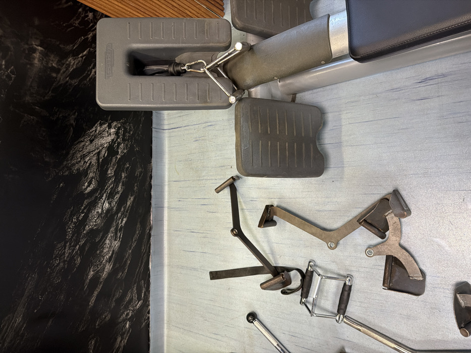 The image depicts an indoor scene, likely a fitness facility or gym. The background features a dark wall covering with a textured, wave-like or abstract pattern. The floor is a light blue-grey, possibly a padded surface, showing faint vertical striations. In the midground and foreground, various pieces of gym equipment and attachments are present. On the floor, several metal attachments, some appearing worn or oxidized, are scattered. These include curved and angled components, some with small rubber or plastic end caps, resembling parts of leg presses or rowing machine footrests. A chrome-plated handle with black rubber grips and a long, thin chrome bar with a black spherical end are also visible. To the right, a significant portion of a large gym machine is visible. This includes a grey, vertically ribbed footplate or back support with the "TECHNOGYM" logo faintly embossed at the top. A cable with a carabiner is attached to this component. Below it, two grey, ribbed footrests are integrated into a larger, silver-toned metal frame. A dark, padded seat or bench, showing stitching along its edge, is partially visible in the bottom right corner. A vertical, ribbed wooden panel is partially visible on the far right, behind the grey Technogym component. No people are present, and no actions or interactions are depicted. The precise location within Montana, Bulgaria, is not discernible from the provided visual information.
