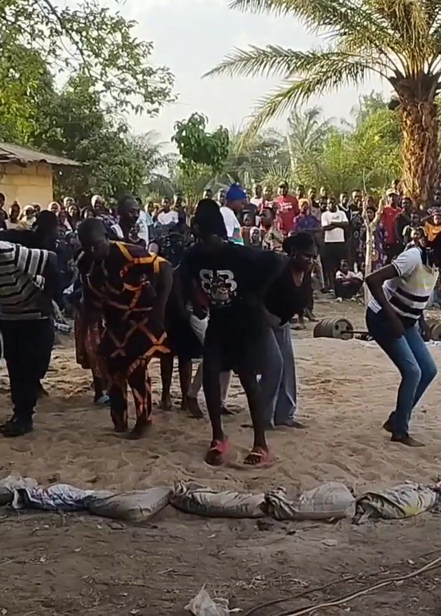 The video depicts a group of people gathered in an outdoor area, likely a village or rural setting, where some individuals are performing a dance. The dancers, numbering around seven, are in the center of a circle marked by what appear to be sandbags or sacks. They are moving in unison to the sound of music, bending forward and swaying. The rest of the crowd stands around the perimeter of the circle, watching the performance. The people are dressed in casual attire. The surrounding environment includes trees, a palm tree, a small building with a corrugated roof, and a sandy ground. The scene suggests a festive or cultural event.